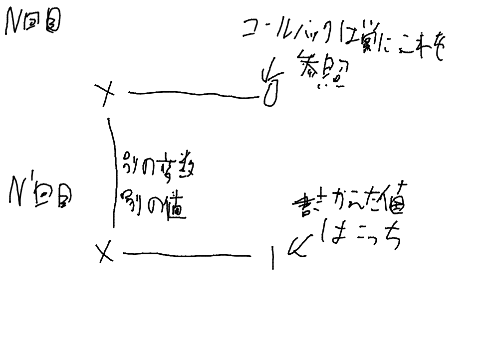 またuseStateが原因で勘違いしやすい所ですが、N回目のxとN'回目のxは全く別の変数です。Reactがいい感じに管理してくれるので同じ変数のように見えますが、JSから見たら全くの別物です。ここがポイントです。