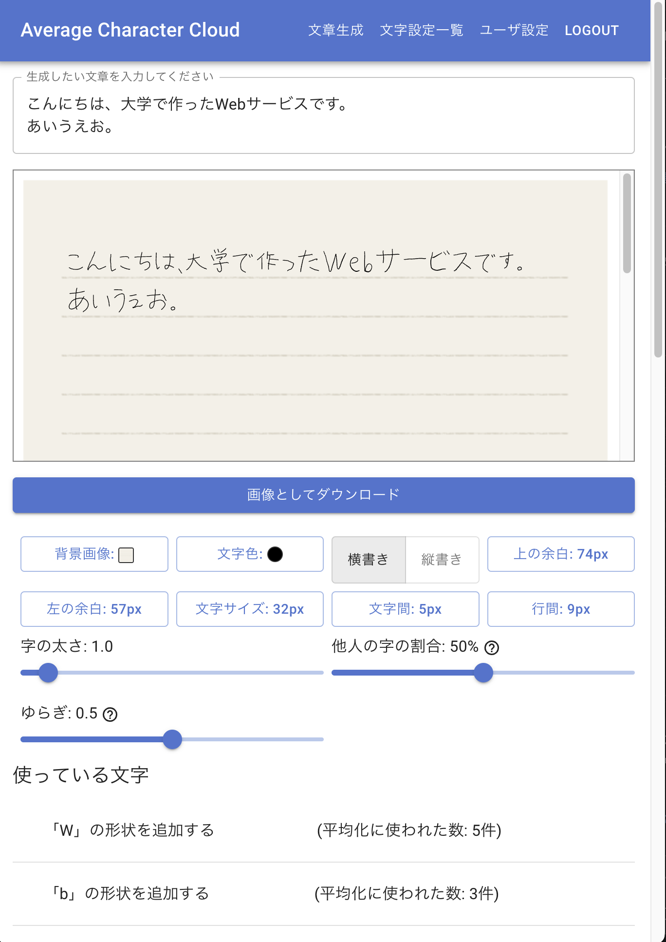 下の画像のように、上のテキスト欄に文字列を入力すると、その文字列に対応する手書き風の画像を生成してくれます。背景画像はユーザが用意してきて、それに合わせて文字サイズや書字方向、行間字間などを設定する仕様です。各文字は、ユーザが登録した手書き文字を複数組み合わせて平均手書き文字という手法で合成し、生成されていますが、これを行うには1字につき複数の手書き文字を登録する必要があり手間なので、デフォルトでは、許可された他のユーザが書いた手書き文字も生成に取り入れる仕様になっています。